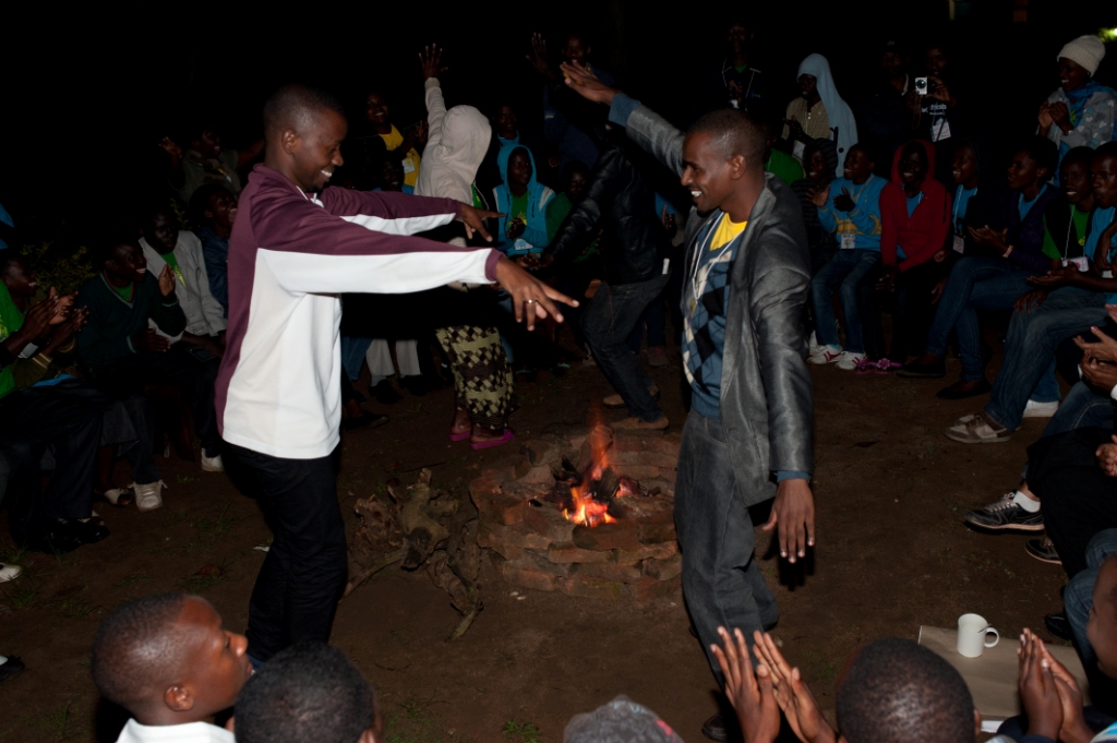 Popular night activities (besides staying up late in the dorms to talk!) included campfire night. Pictured left to right: Michel, our camp co-director, teaches William, our Kenyan volunteer, some Rwandan dance moves to the delight of campers. William also led a workshop on starting a self help group and shared some of his personal peace-building experience which includes food security and development in one of the most violent-prone and drought-striken regions of Kenya.